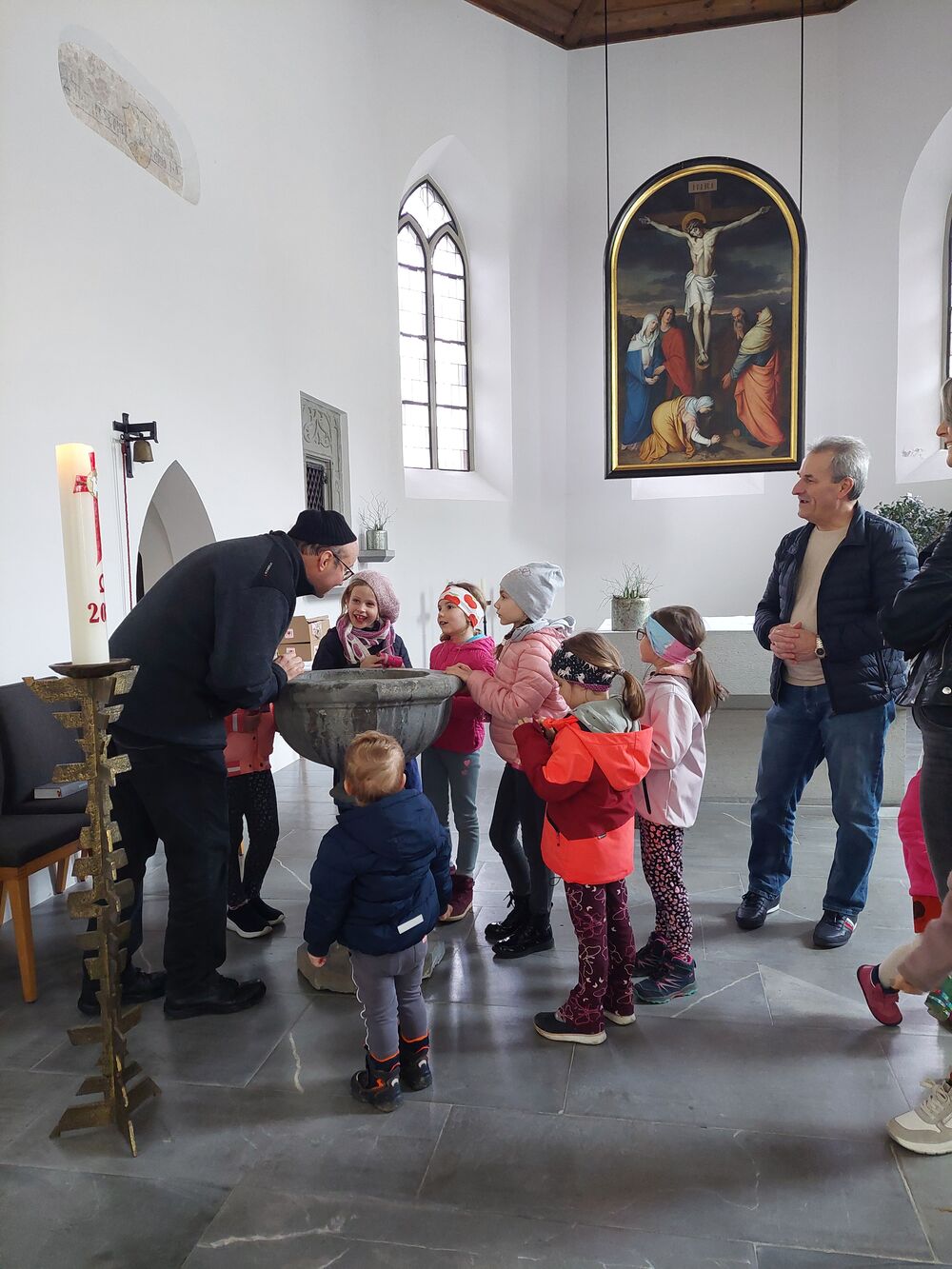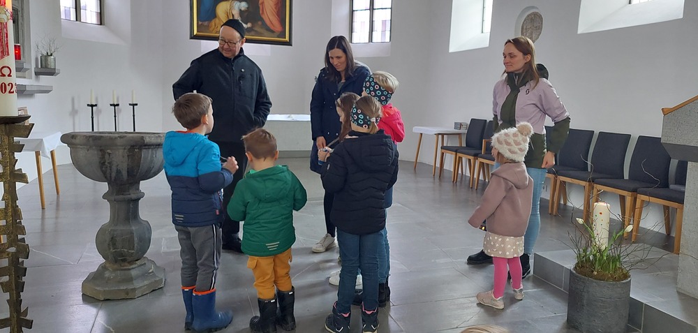 Ein Blick durch das selbstgebastelte Fernrohr und dann ging es los auf Entdeckungstour durch die Kirche. In Gruppen besuchten die Kinder die verschiedensten Stationen. Die Sakristei wurde von Dietmar Hirschbühl erklärt, Pfarrer Ratz ließ die Augen beim neuen Taufbecken, der Osterkerze sowie dem Altar strahlen. Sandra stimmte mit den Kindern die Orgel an und mit Anna wurden bei den Opferkerzen Wünsche zu Gott gesendet und den Beichtstuhl begutachtet.  Zum Abschluss durften die Erstkommunionskinder noch den Kirchturm erklimmen.